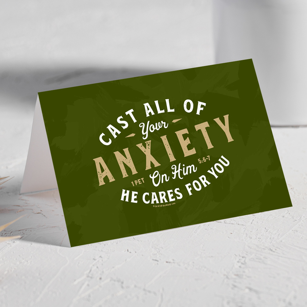 Encourage others with this “Cast Your Anxiety” greeting card based on 1 Peter 5:6-7. “Humble yourselves, therefore, under God’s mighty hand, that he may lift you up in due time. Cast all your anxiety on him because he cares for you.”